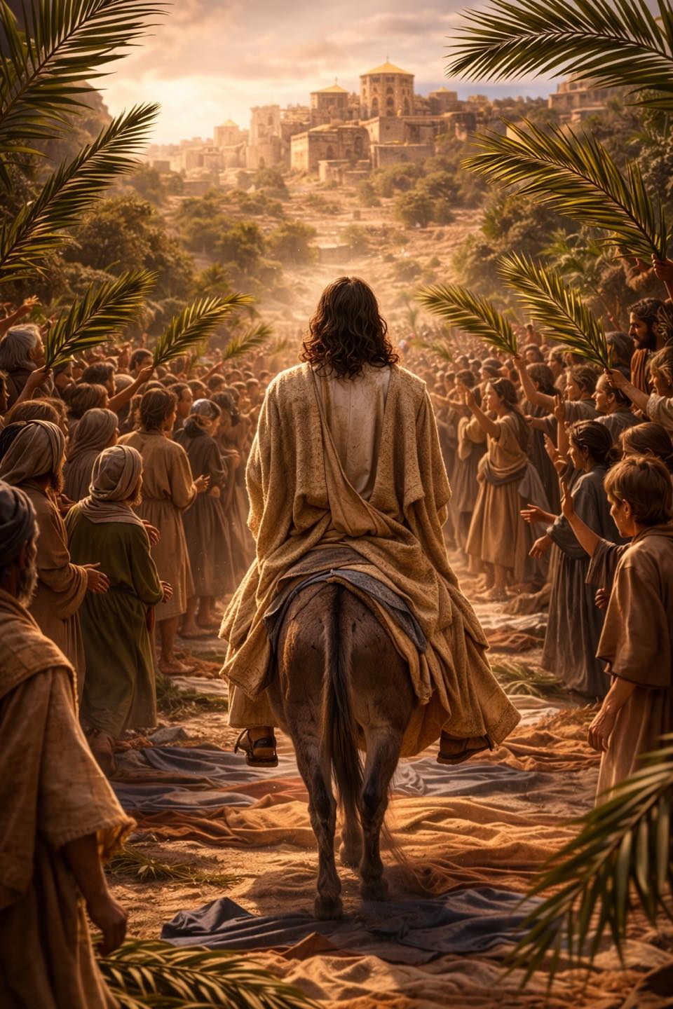 "Dagen etter fikk den store folkemengden som var kommet til høytiden, høre at Jesus var på vei til Jerusalem. Da tok de palmegrener og gikk ut for å møte ham, og de ropte: Hosianna! Velsignet være han som kommer i Herrens navn, Israels konge! Men Jesus fant et ungt esel og satte seg på det, som det står skrevet: Frykt ikke, Sions datter! Se, din konge kommer, sitternde på en eselfole. Dette skjønte ikke hans disipler fra først av. Men da Jesus var blitt herliggjort, da mintes de at dette var skrevet om ham, og at de hadde gjort dette for ham. Folkeskaren som hadde vært med ham da han kalte Lasarus ut av graven og oppvakte ham fra de døde, vitnet om det. Dette var også grunnen til at folket gikk ham i møte, fordi de hadde hørt at han hadde gjort dette tegnet. Fariseerne sa da seg imellom: Dere ser at dere ikke oppnår noe! Se, all verden løper etter ham!" (Johannes 12:12-19)